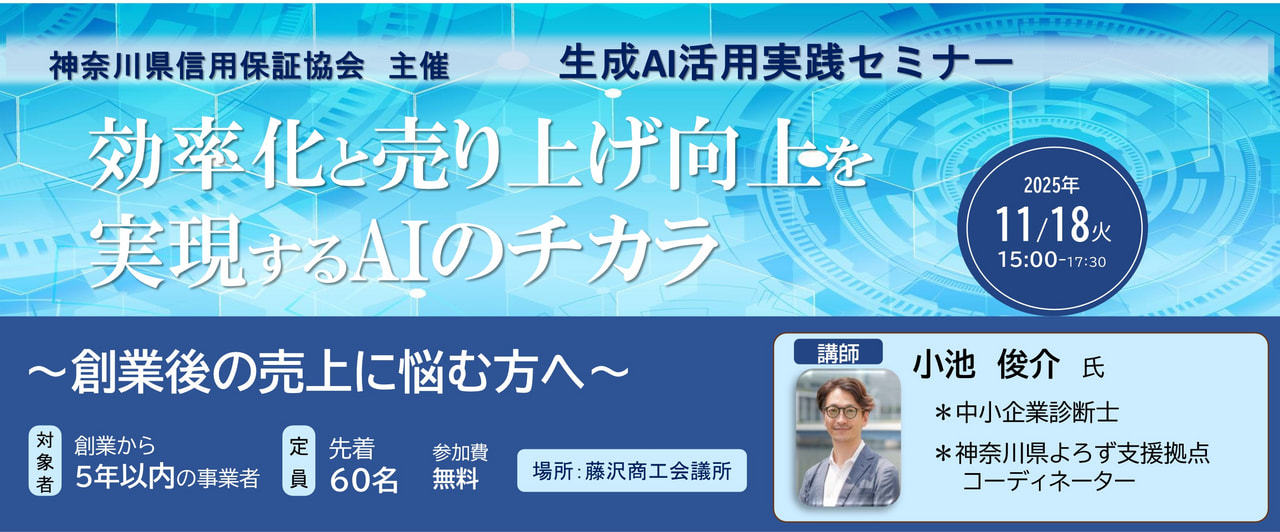 神奈川県信用保証協会主催 生成AI活用実践セミナー 『効率化と売り上げ向上を実現するAIのチカラ』2025/11/18神奈川県信用保証協会主催 生成AI活用実践セミナー 『効率化と売り上げ向上を実現するAIのチカラ』 創業から5年以内で創業後の売上に悩む事業者の方 AIを活用して戦略を再構築し、売り上げ拡大を目指しま
