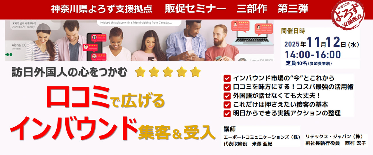 神奈川県よろず支援拠点 販促セミナー三部作 第三弾『口コミで広げるインバウンド集客&受入』2025/11/1211月開催☆販促セミナー三部作 第三弾 販促セミナー三部作 第三弾は、“訪日外国人の集客や対応にお悩み”の方向け 本セミナーでは、世界中の旅行者が利用するTripAdvisor(トリップアドバイザー)