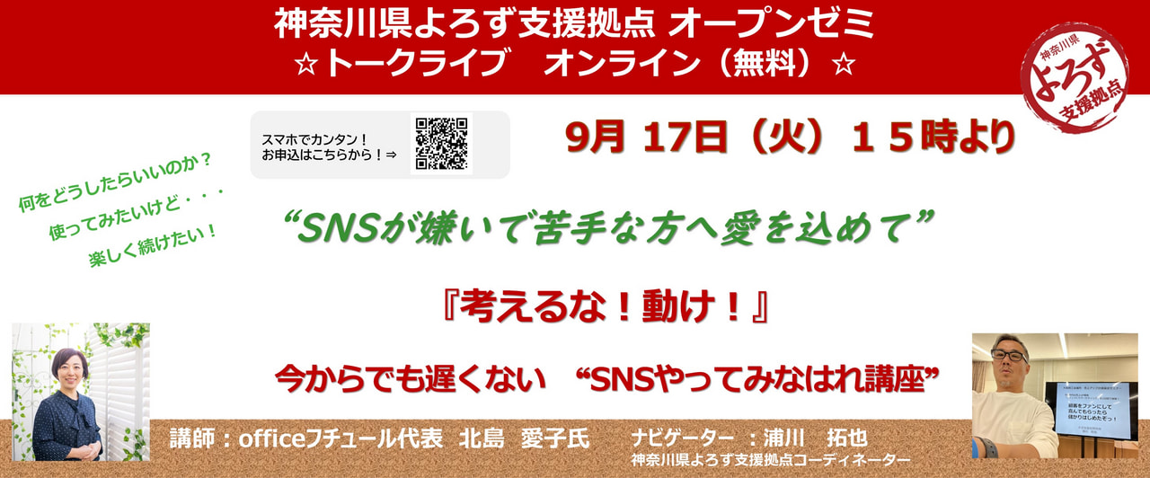 こんにちは!9月のよろず☆トークライブのお知らせです。担当コーディネーター“愛”にあふれる企画! 9月のトークライブは、今からでも遅くない“SNSやってみなはれ講座” です! 楽しい!反応がうれしい!